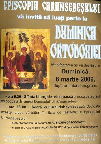 La praznicul “Duminicii Ortodoxiei”, prima duminică din Postul Mare, Episcopia Caransebeşului organizează o manifestare dedicată acestei sărbători.Manifestarea va avea loc duminică, 8 martie 2009, după următorul program: ora 9.00 – [...]
