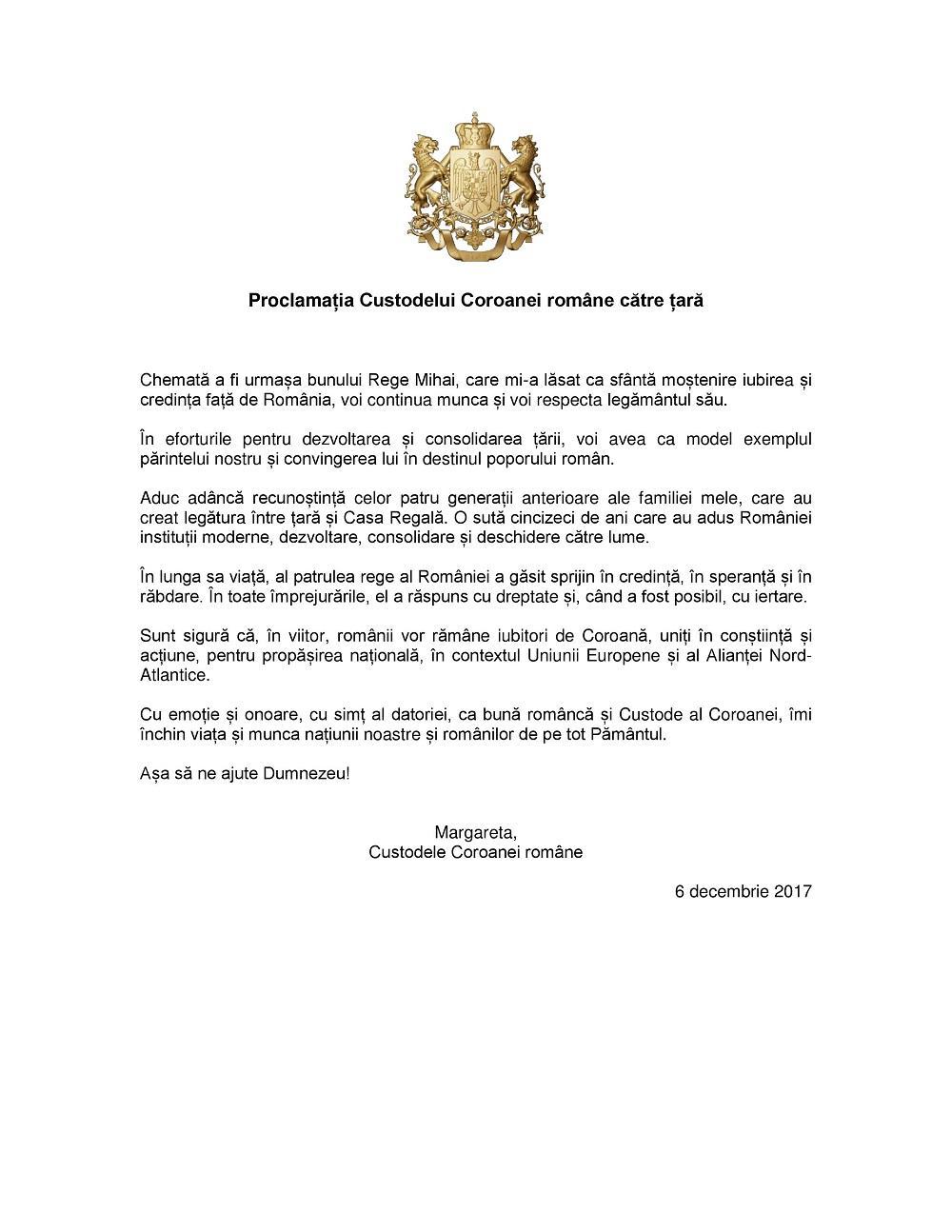Principesa Margareta: Proclamatia Custodelui Coroanei romane catre tara