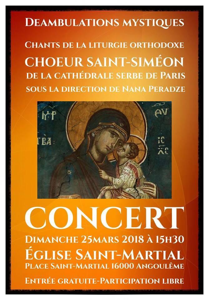 Corul Sfântul Simeon, condus de Nana Peradze, va susține un concert în Angoulême, în Biserica Saint-Martial, în Franța, duminică, 25 martie, la ora 15:30.