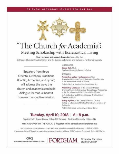 Primul seminar de “Studii ortodoxe orientale” va avea loc la Universitatea Fordham [https://www.fordham.edu/orthodoxy] , marți, 10 aprilie 2018 – The Bronx, New York 10458, Statele Unite ale Americii. Episcopul Kyrillos, [...]