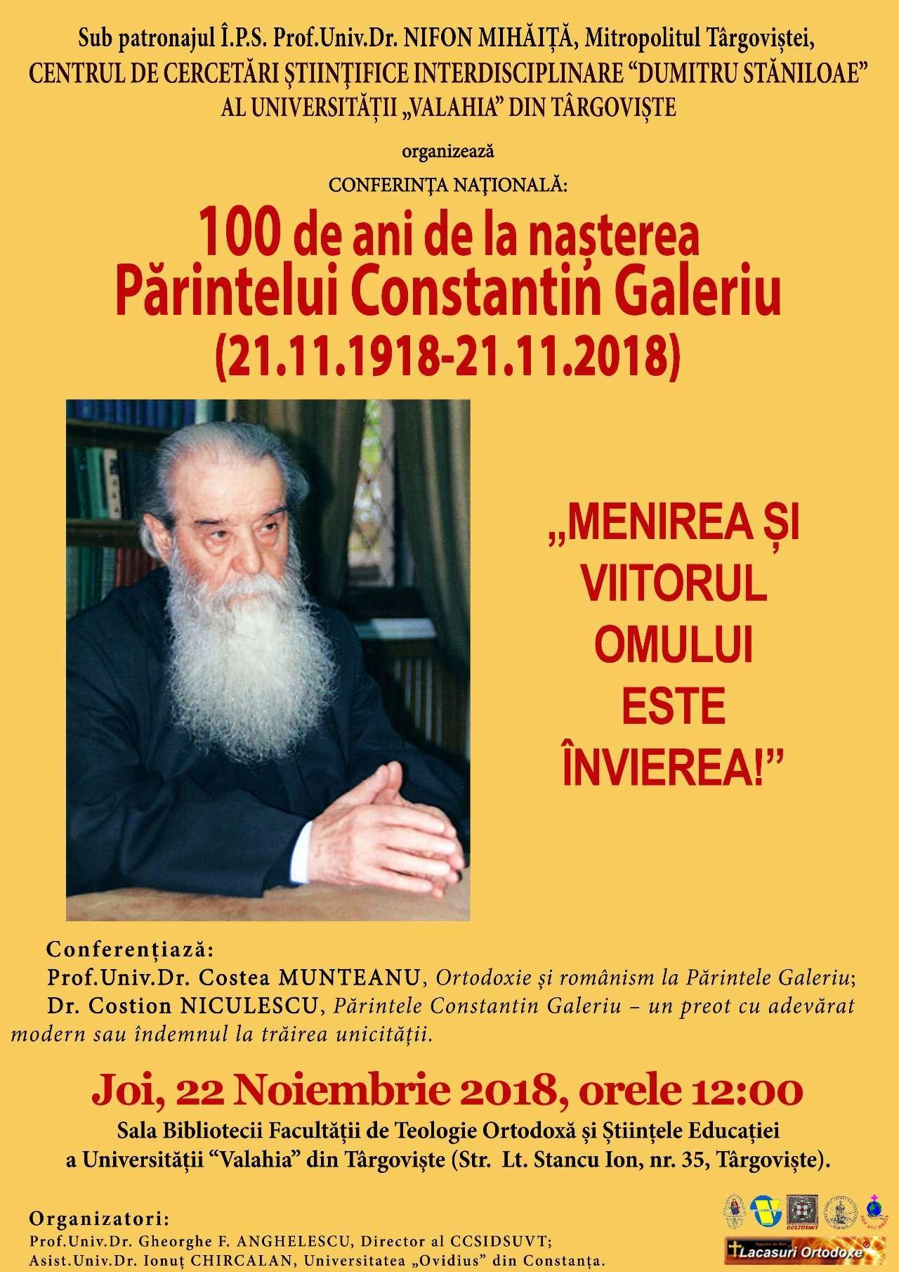 100 de ani de la nașterea Părintelui CONSTANTIN GALERIU: Târgoviște, 22 noiembrie – în parteneriat media Lăcasuri Ortodoxe