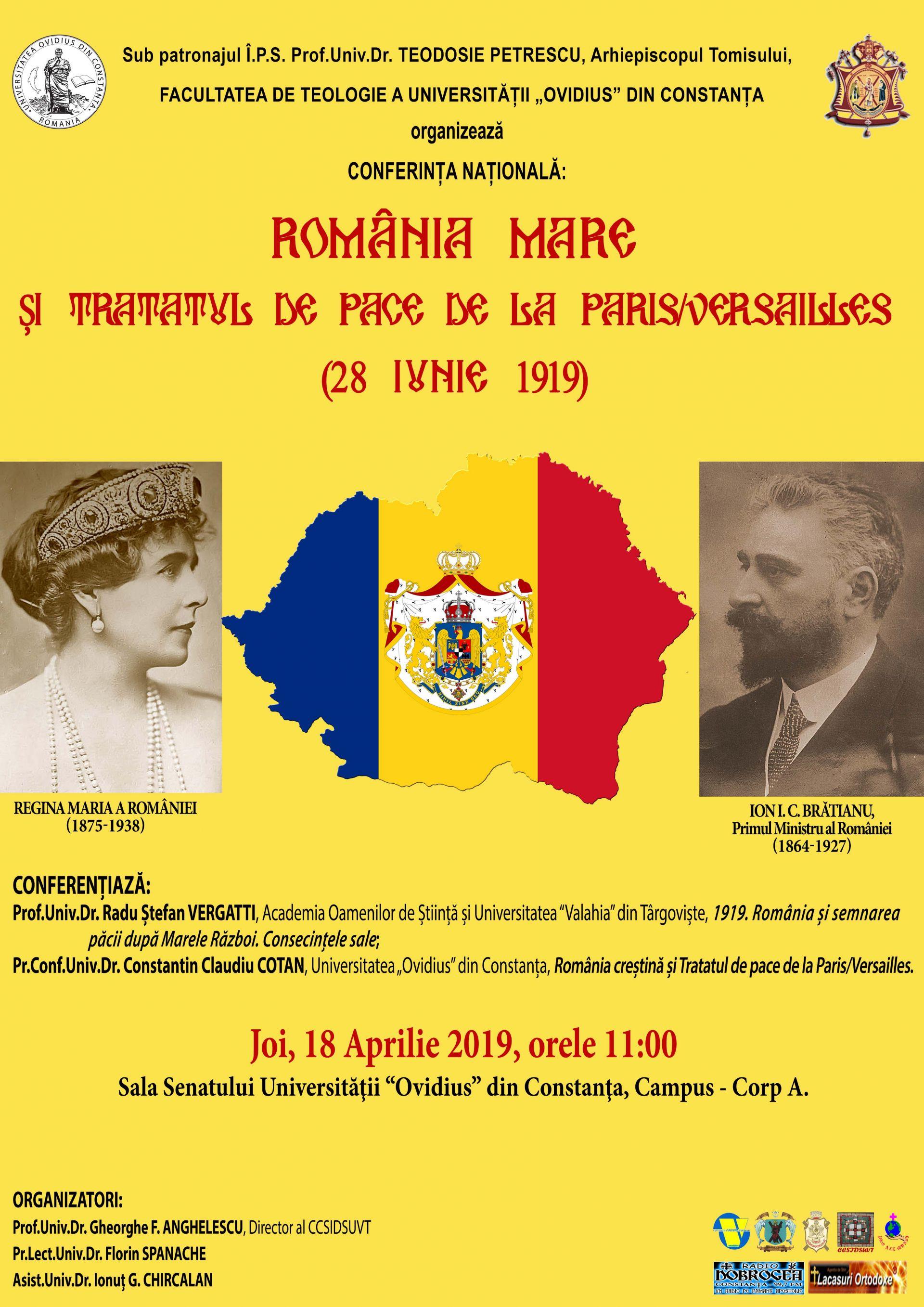 Joi, 18 Aprilie 2019, orele 11:00, sub patronajul Î.P.S. Prof.Univ.Dr. Teodosie Petrescu, Arhiepiscopul Tomisului, Facultatea de Teologie a Universității “Ovidius”; din Constanţa organizează Conferinţa Naţională: România Mare și Tratatul de [...]