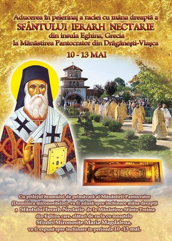 Racla cu mâna dreaptă a Sfântului Ierarh Nectarie, din Insula Eghina, Grecia, va sosi în România, la Drăgănești-Vlașca, cu ocazia hramului de primăvară al Mânăstirii Pantocrator: Duminica Mironosițelor. Evenimentele legate [...]