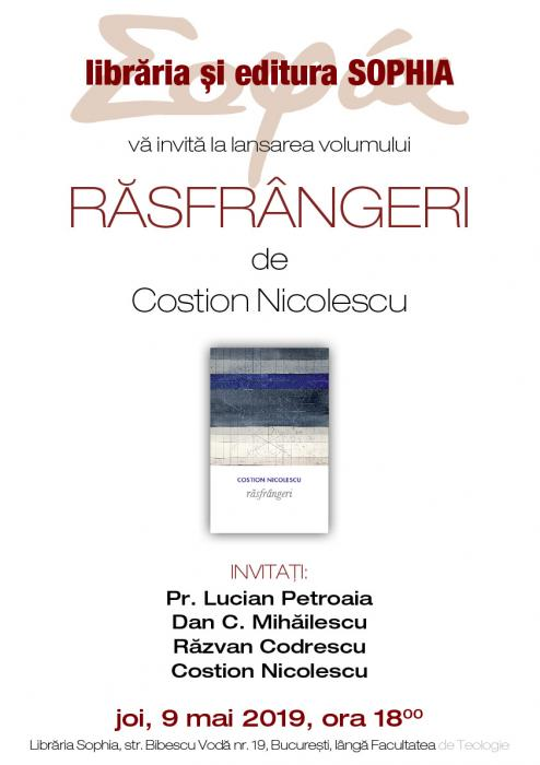 Librăria și Editura Sophia vă invită să participați joi, 9 mai 2019, ora 18.00, la lansarea volumului ”Răsfrângeri” de Costion Nicolescu. Invitați: Pr Lucian Petroaia, Dan C Mihăilescu, Răzvan Codrescu, [...]