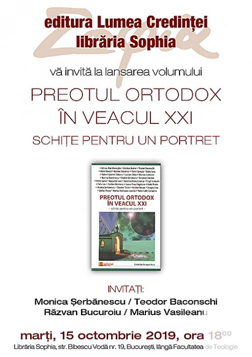 La Librăria Sophia, marți, 15 octombrie, ora 18:00, a avut loc o nouă lansare de carte:PREOTUL ORTODOX ÎN VEACUL XXI – schițe pentru un portret.Au participat: Monica Șerbănescu, Teodor Baconschi, [...]