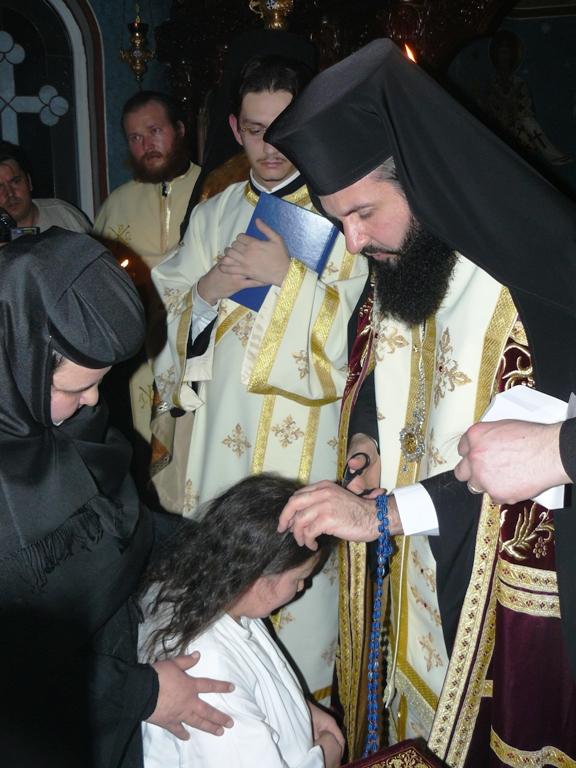 Cele două surori, care au fost tunse întru monahii, au fost purtate sub mantia călugărească a Preacuvioase Maici Stareţe, monahia Magdalena Ghindăş. După oficierea ierurgiei tunderii în monahism, Preasfinţitul Părinte Episcop Lucian a ţinut un cuvânt de învăţătură, în care a subliniat importanţa menţinerii făgăduinţelor de la călugărie în toată viaţa, precum şi pentru credincioşii mireni, care sunt datori să păstreze făgăduinţa de la taina cununiei neîntreruptă şi veşnică.