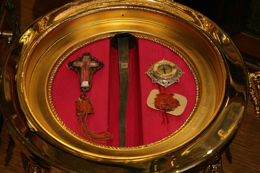 – o părticică dintr-unul din cuiele cu care a fost răstignit Domnul nostru Iisus Hristos,