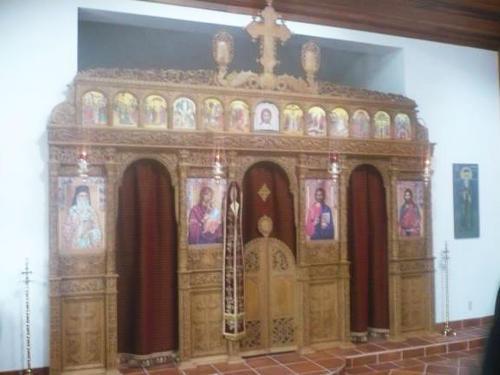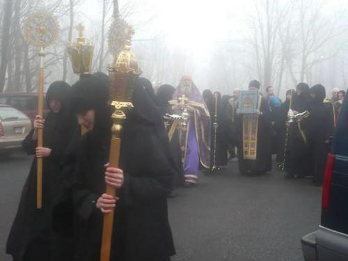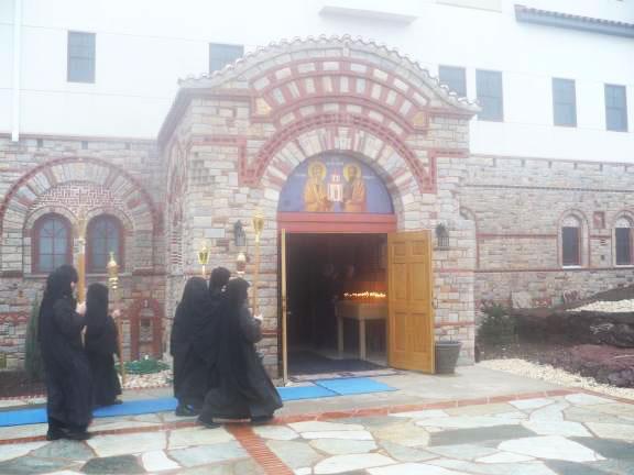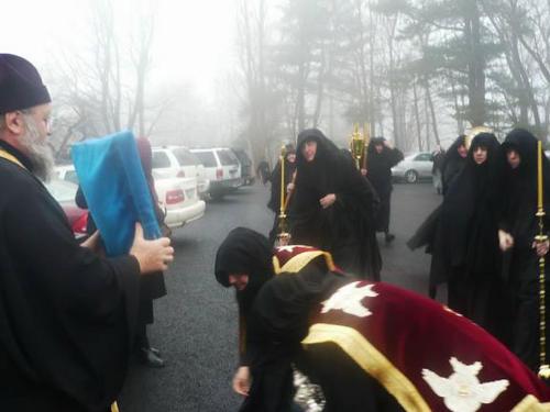 Icoana a fost întâmpinată de Părintele Mark, de măicuţele mănăstirii şi de pelerini. O procesiune a crucii însoţită de sunetul clopotelor şi de rugăciunile greceşti cântate au adus icoana de la porţile mănăstirii până în biserică, unde a fost pusă pe un analoghion, în naos, după care a început Liturghia.