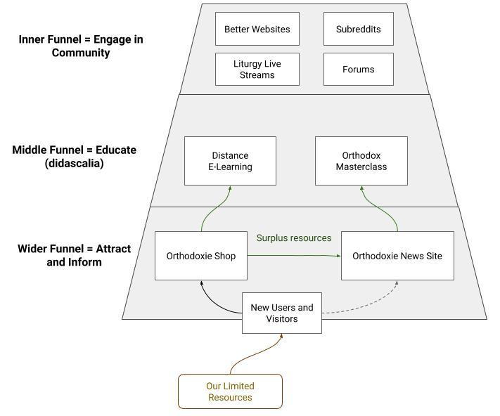 Vom investi cea mai mare parte, din resursele noastre limitate, în magazin. Vom transfera, apoi, câștigurile din Magazin, pentru a traduce Orthodoxie.com în engleză (ceea ce deja am început) și continuăm să dezvoltăm prima noastră etapă a Pâlniei. Creșterea din prima etapă va aduce mai mulți oameni în cea de-a doua etapă, pe care o vom folosi pentru a educa mai mult oamenii și a îi introduce mai bine în Ortodoxie.