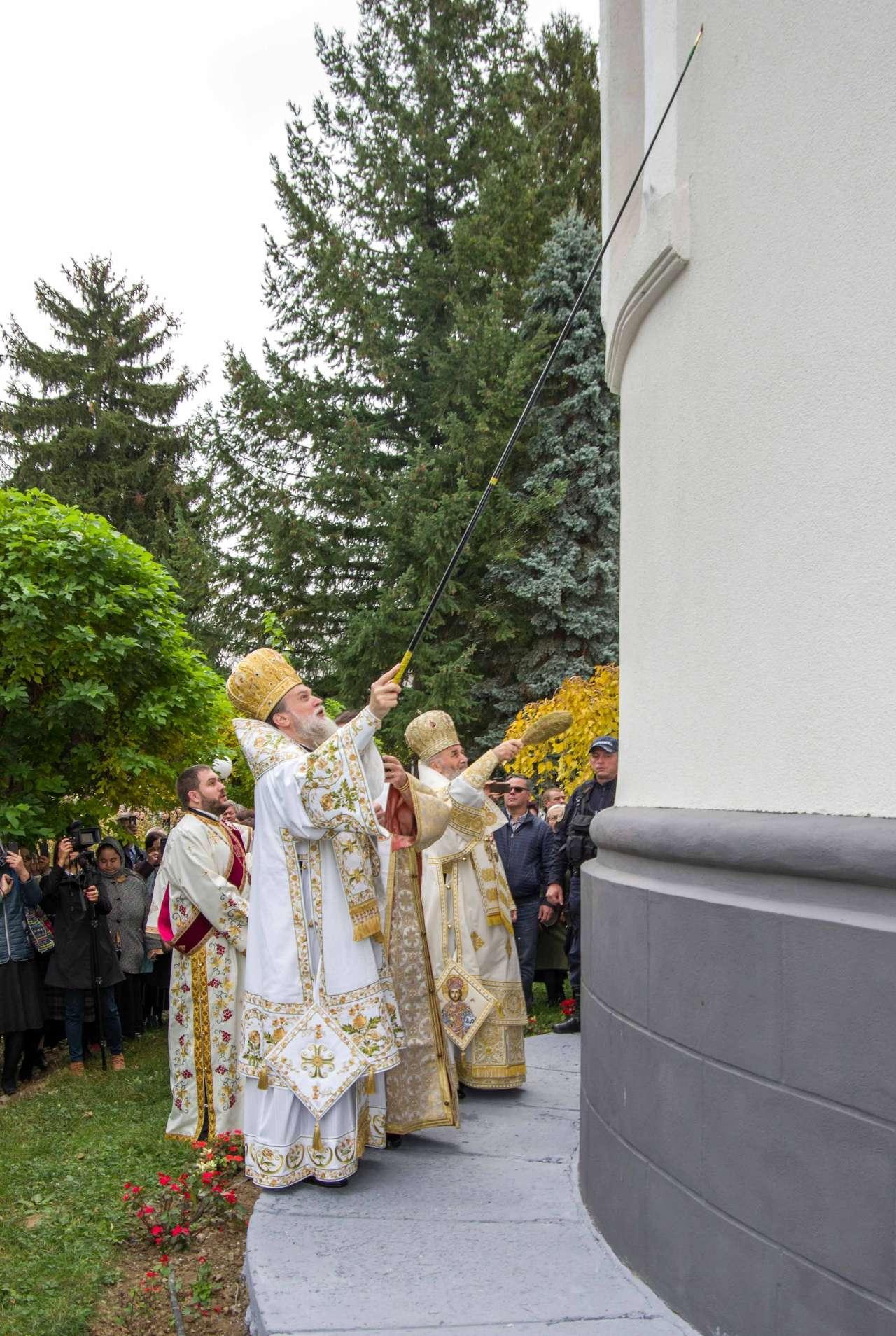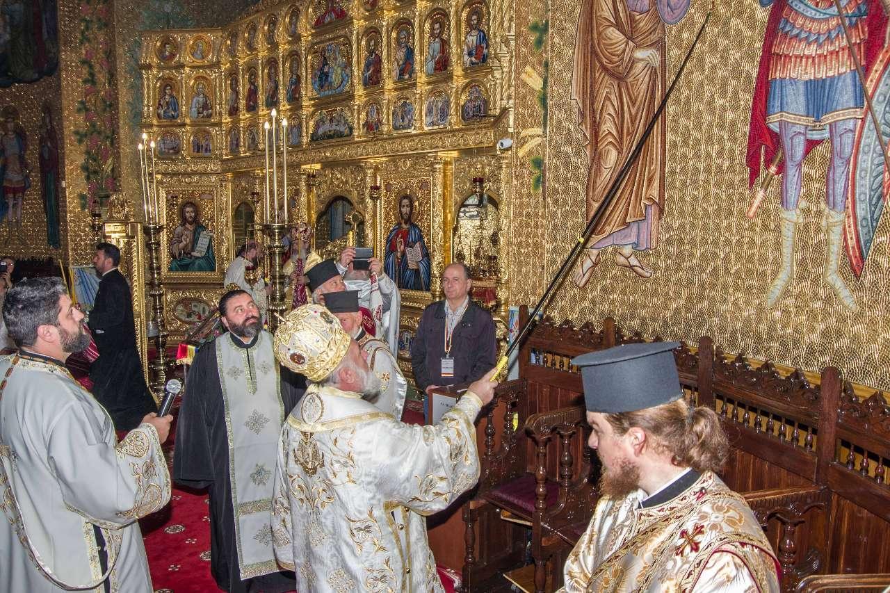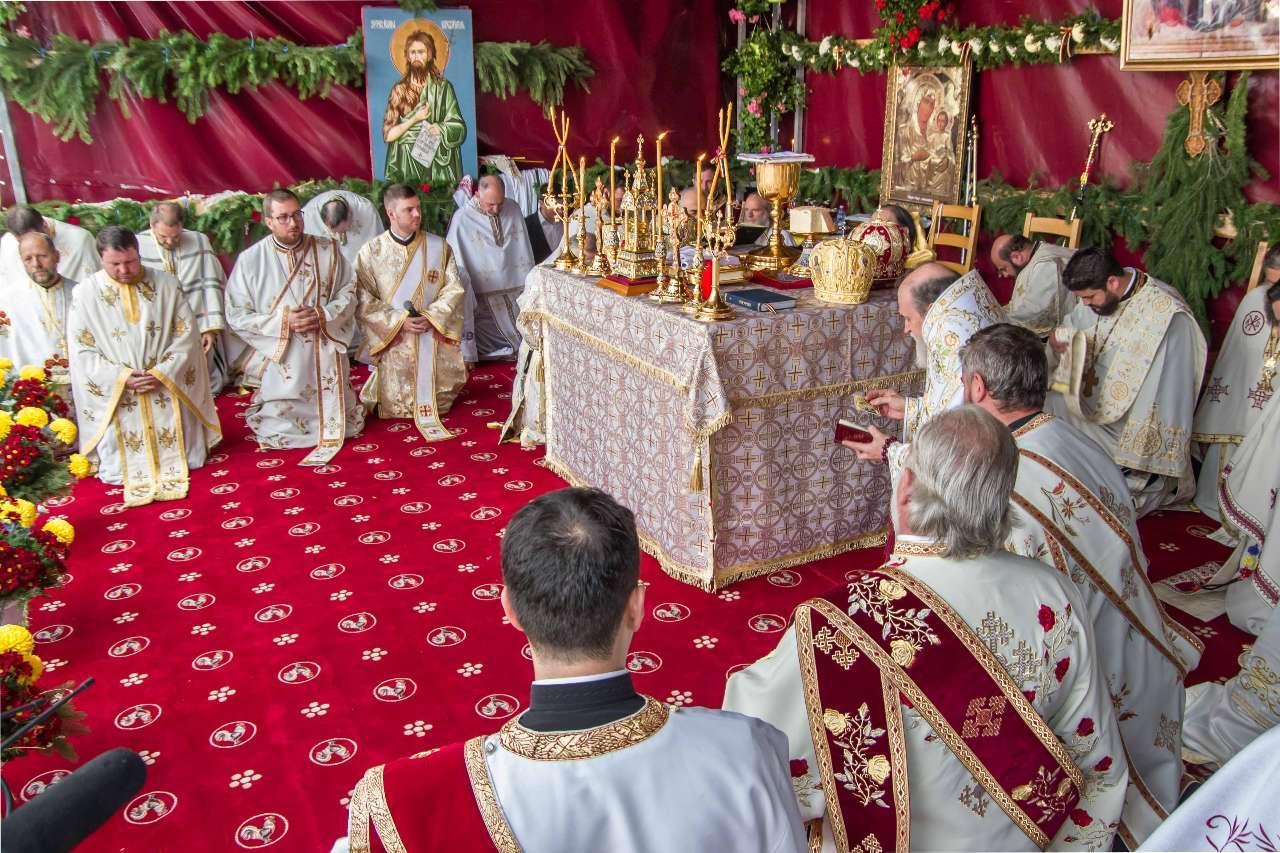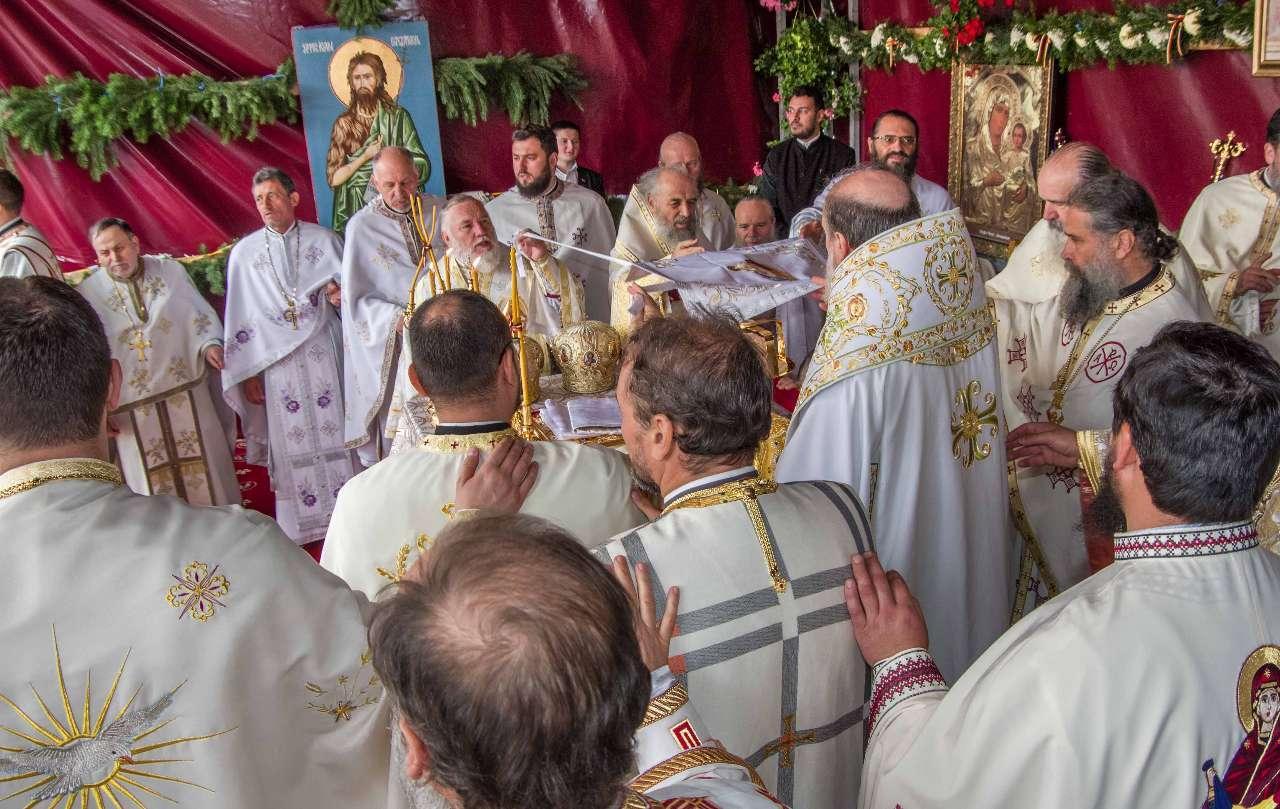 Preasfințitul Părinte Visarion, Episcopul Tulcii, a slujit împreună cu ÎPS Teodosie Arhiepiscopul Tomisului, ÎPS Casian Arhiepiscopul Dunării de Jos și PS Vincențiu Episcopul Sloboziei și Călărașilor. De asemenea, la slujbă a participat și Preacuviosul Părinte Iov, starețul Sfintei Mânăstiri Halmyris – Murighiol, Tulcea, unde se află cele mai vechi sfinte moaște descoperite la noi în țară: Sfintele Moaște ale Sfinților Mucenici Epictet și Astion. Pictura care a fost sfințită a fost realizată în mozaic auriu de 24 K.