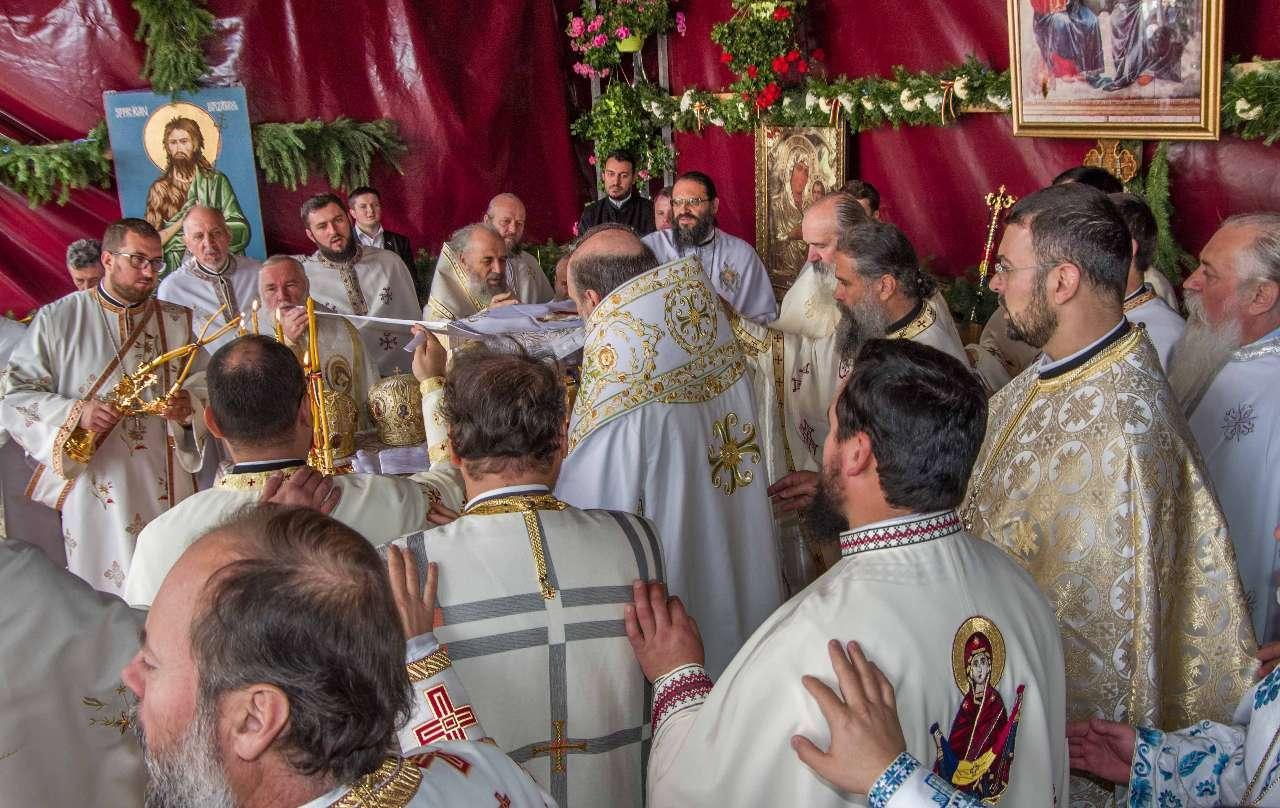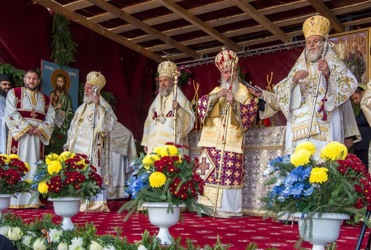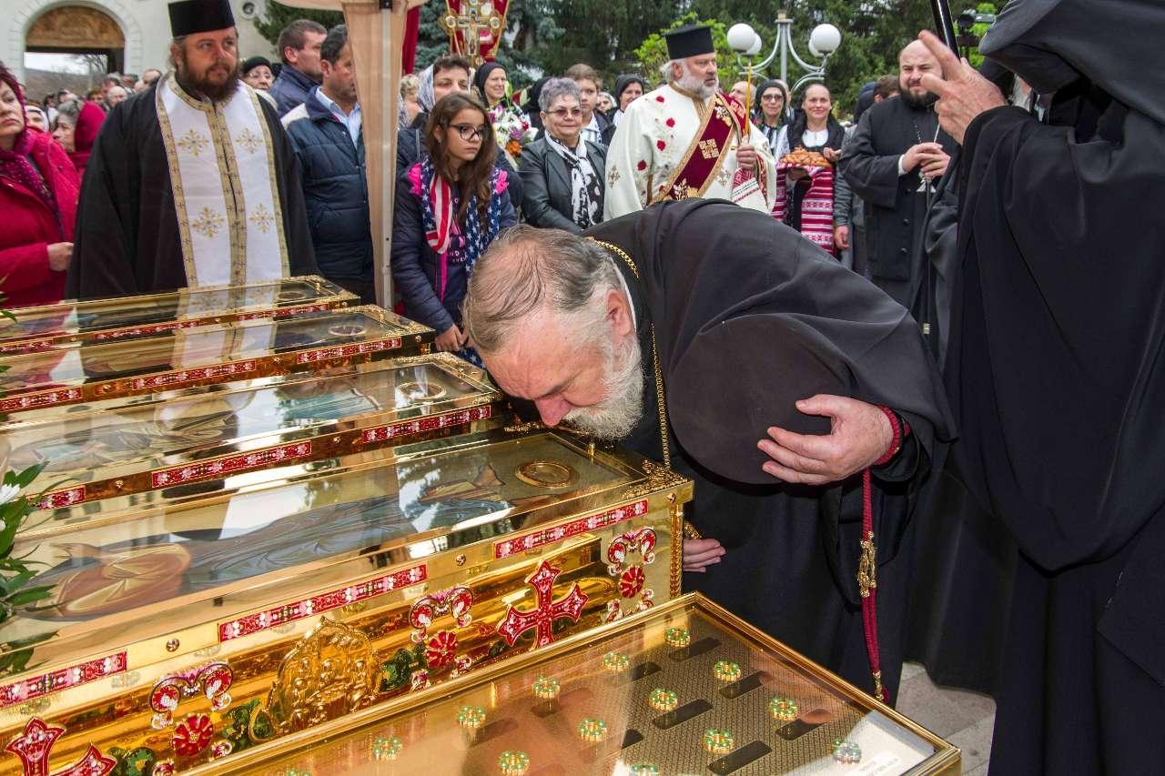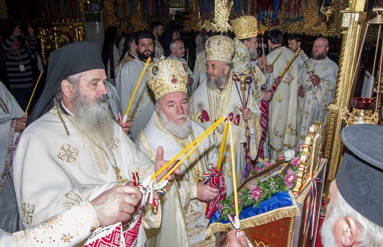 Preasfințitul Părinte Visarion, Episcopul Tulcii, a slujit împreună cu ÎPS Teodosie Arhiepiscopul Tomisului, ÎPS Casian Arhiepiscopul Dunării de Jos și PS Vincențiu Episcopul Sloboziei și Călărașilor. De asemenea, la slujbă a participat și Preacuviosul Părinte Iov, starețul Sfintei Mânăstiri Halmyris – Murighiol, Tulcea, unde se află cele mai vechi sfinte moaște descoperite la noi în țară: Sfintele Moaște ale Sfinților Mucenici Epictet și Astion. Pictura care a fost sfințită a fost realizată în mozaic auriu de 24 K.
