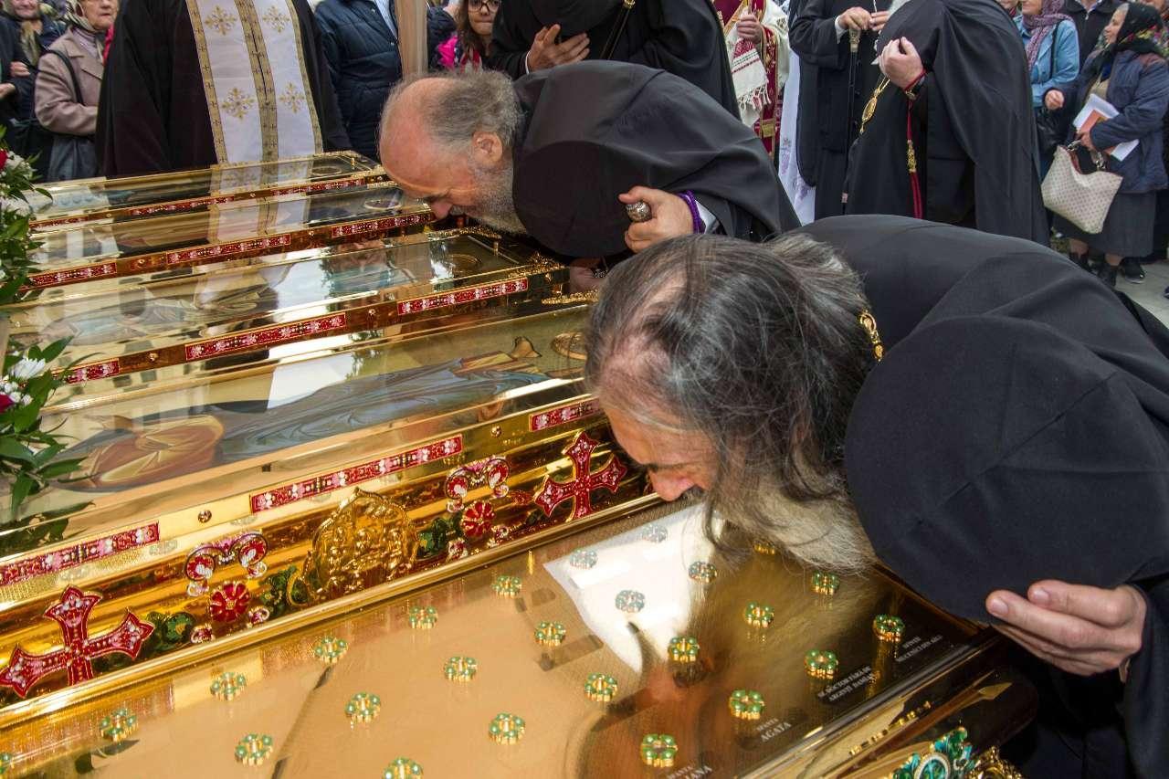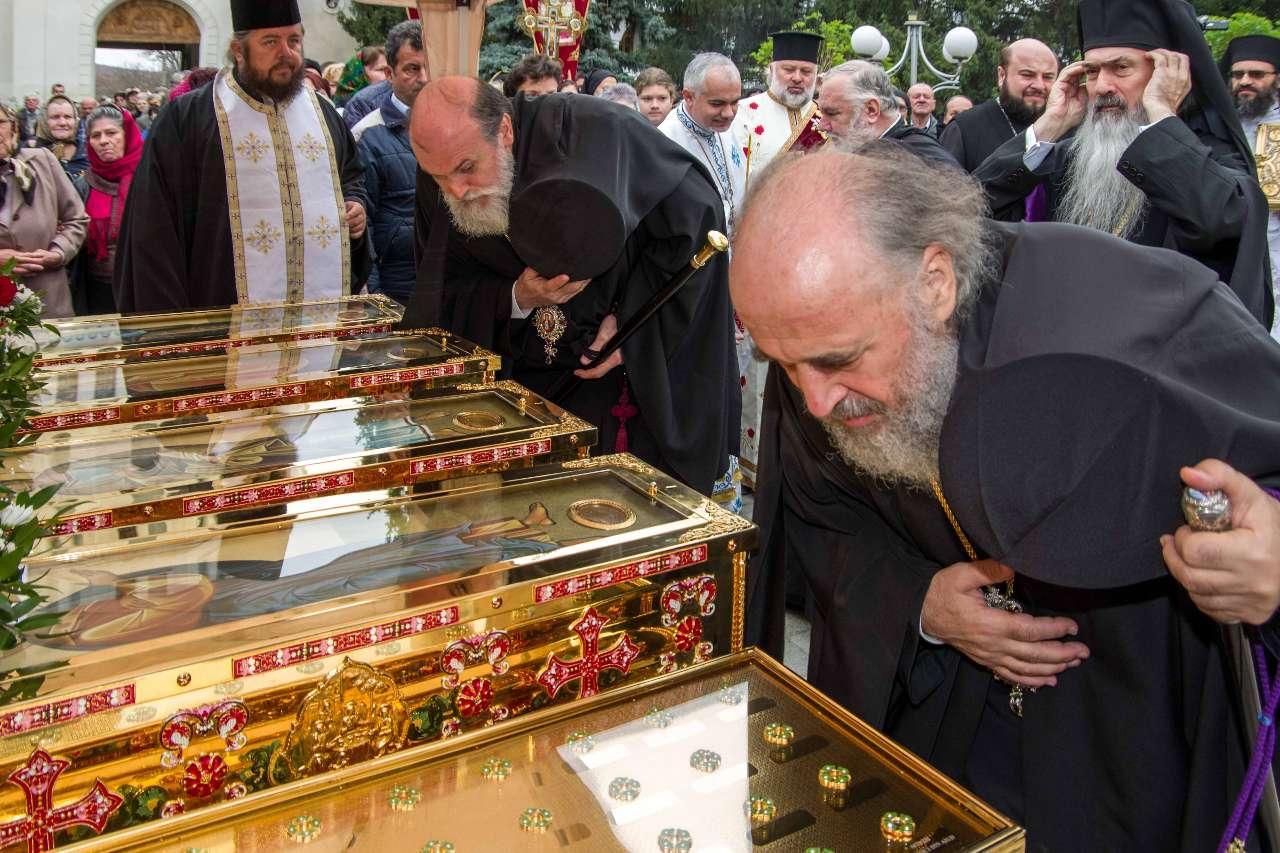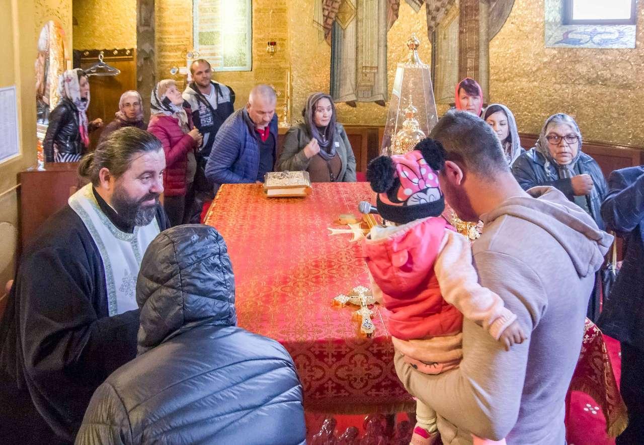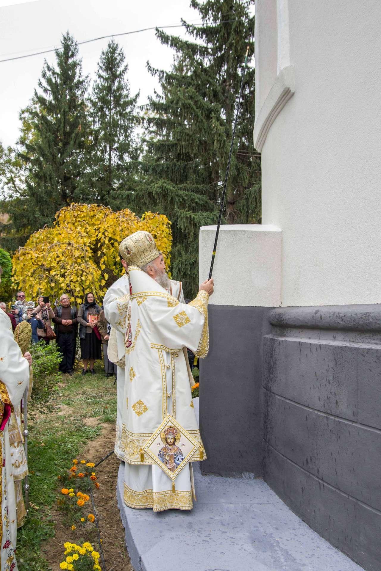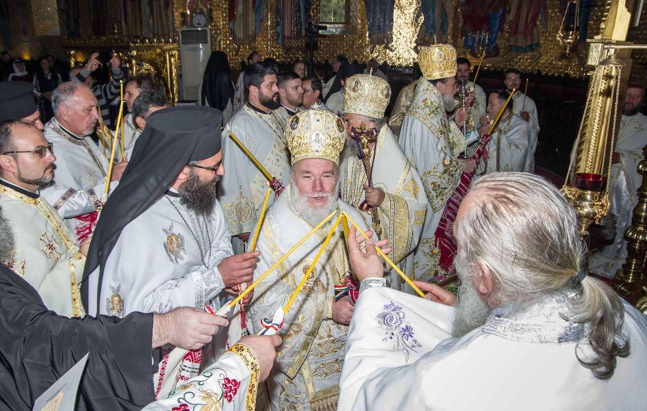 Preasfințitul Părinte Visarion, Episcopul Tulcii, a slujit împreună cu ÎPS Teodosie Arhiepiscopul Tomisului, ÎPS Casian Arhiepiscopul Dunării de Jos și PS Vincențiu Episcopul Sloboziei și Călărașilor. De asemenea, la slujbă a participat și Preacuviosul Părinte Iov, starețul Sfintei Mânăstiri Halmyris – Murighiol, Tulcea, unde se află cele mai vechi sfinte moaște descoperite la noi în țară: Sfintele Moaște ale Sfinților Mucenici Epictet și Astion. Pictura care a fost sfințită a fost realizată în mozaic auriu de 24 K.