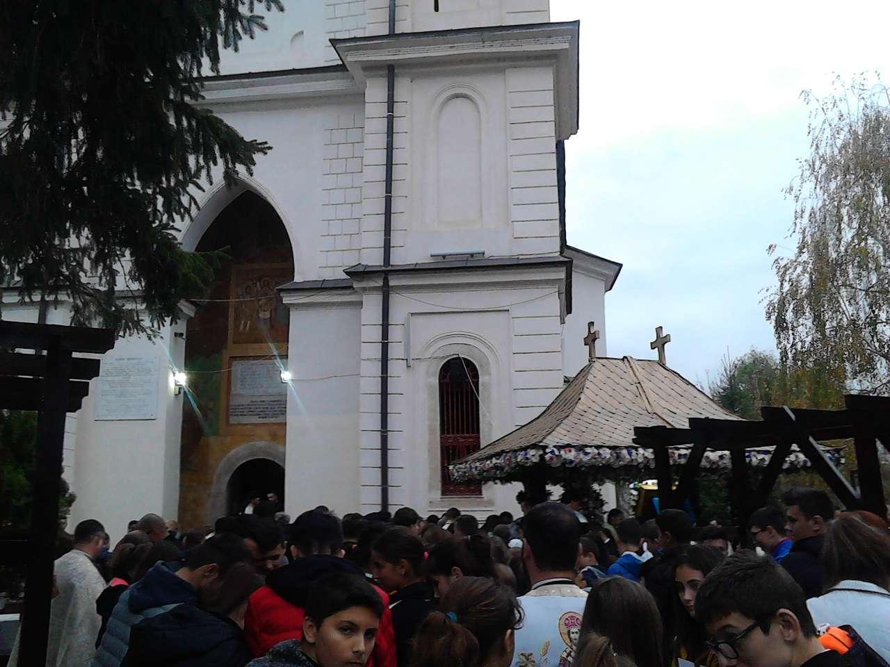 În jurul orei 16, practic miile de credincioși au luat cu asalt zidurile mănăstirii, recucerind duhovnicește lăcașul sfânt în care să-și verse rugăciunile lor către Maica Domnului, poposita din nou la ei, pe parcursul a aproape o săptămână de găzduire. Tineri urcați pe meterezele Mănăstirii, încercând sa surprindă de “cat mai aproape” de Sfânta Cruce a Clopotniței, imagini pe telefoanele proprii, știind și mărturisindu-ne (chiar dacă erau doar în clasa a VI-a, cum s-au prezentat) ca “e bine sa urci cat mai sus, ca sa vezi cat mai bine”, păzind hainele și ghiozdanele colegilor “fugiți” pentru asta de la școală, aveau sa cânte într-un glas cu Episcopul și preoții lor, rasunand spre lumea din afara, “Apărătoare Doamna…”.