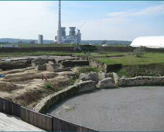 Vedere asupra teritoriului așezării din Viminacium, dinspre Amfiteatru, indicând centrala electrică și exploatația minieră.Fotografii de L.Diers, septembrie 2014