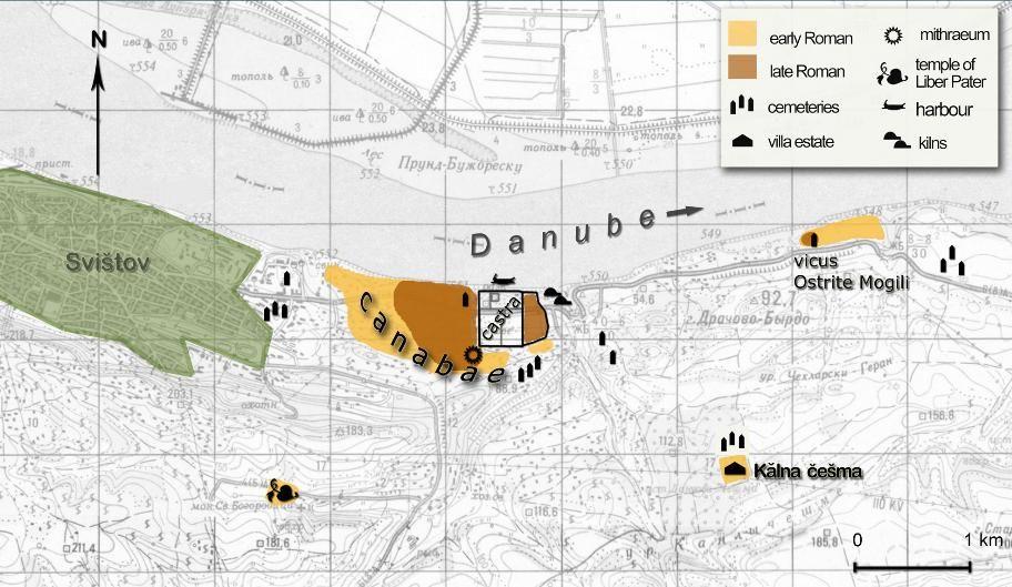 Situația topografică în Novae, arătând modernul Sviștov, tabăra de legiune, canabae șivicus din Ostrite Mogili. © Agnieszka Tomas, Varșovia / L.Diers