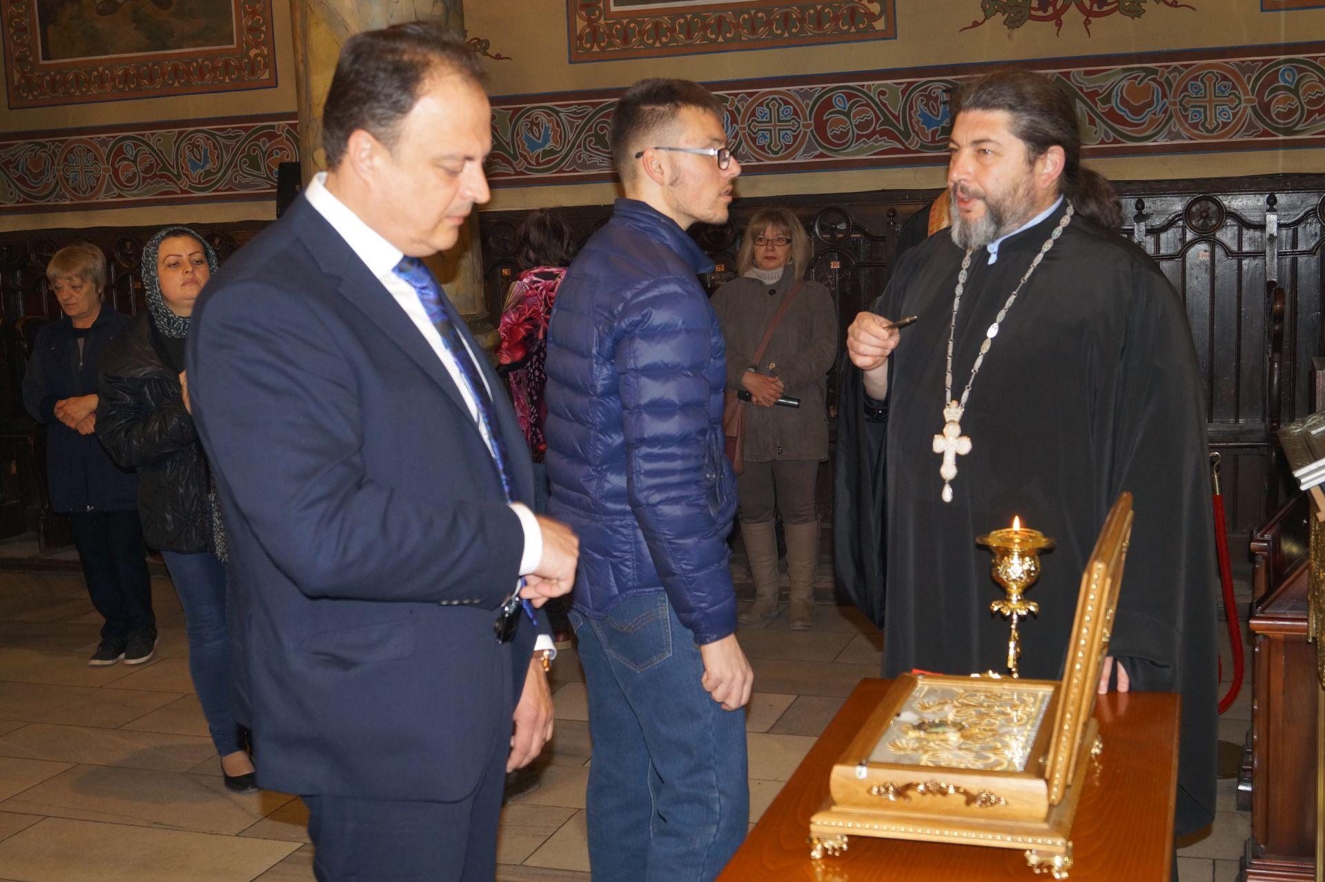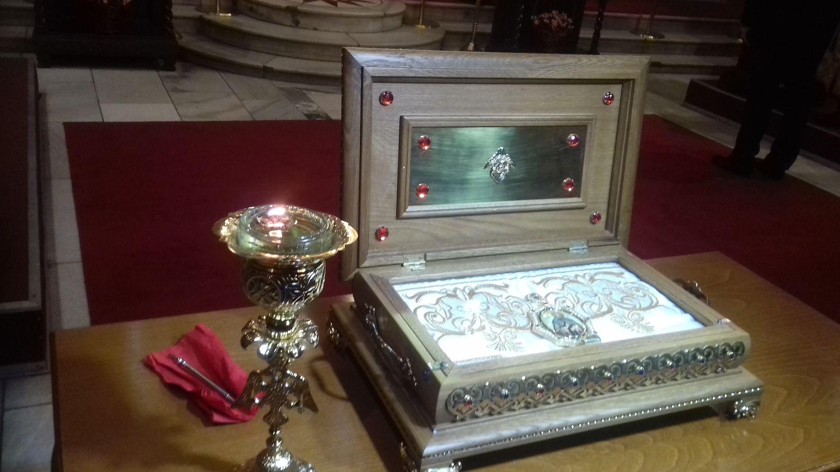 Această raclă sfântă a fost oferită spre închinare, chiar din mâinile Mitropolitului Naum, celor doi Arhierei invitați, apoi a fost așezată pe o masă, în Catedrală, alături de o candelă, urmând inchinarea clerului slujitor și a credincioșilor prezenți la această sărbătoare locală.