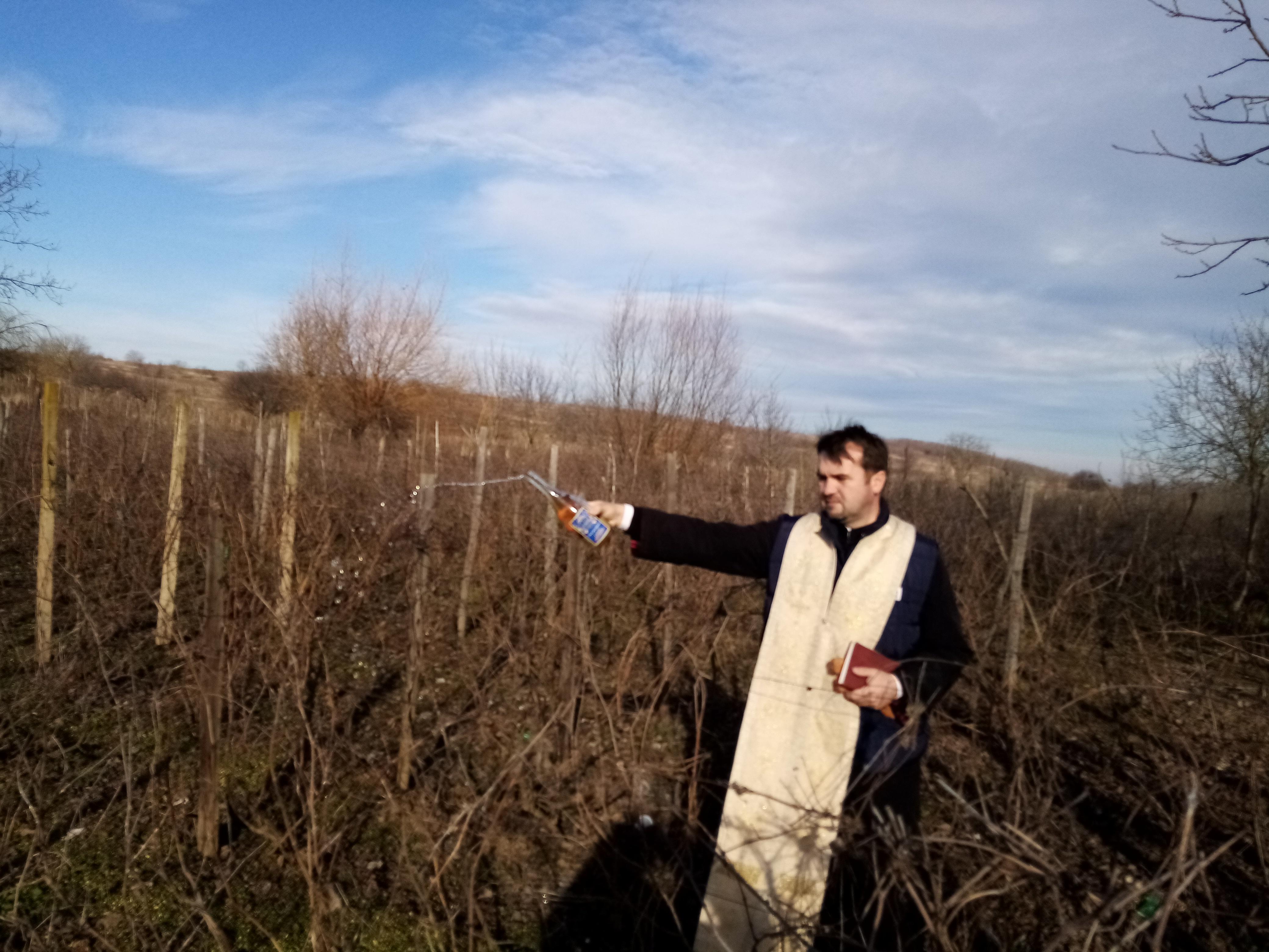 Apoi, o parte din cei prezenți s-a deplasat la câmp, unde preotul a binecuvântat țarinile și s-a rugat pentru buna întocmire a văzduhului și pentru îmbelșugarea roadelor pământului, stropind cu Agheazmă, apoi cu vin, coardele de viță de vie.