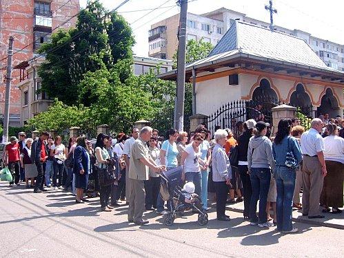 scoase afară, pentru închinare, mai mulţi credincioşi au aşteptat, veniţi fie de dimineaţă, fie pe parcursul zilei, fără a bloca traficul sau a stârni murmur, bucurându-se împreună de toate darurile zilei.