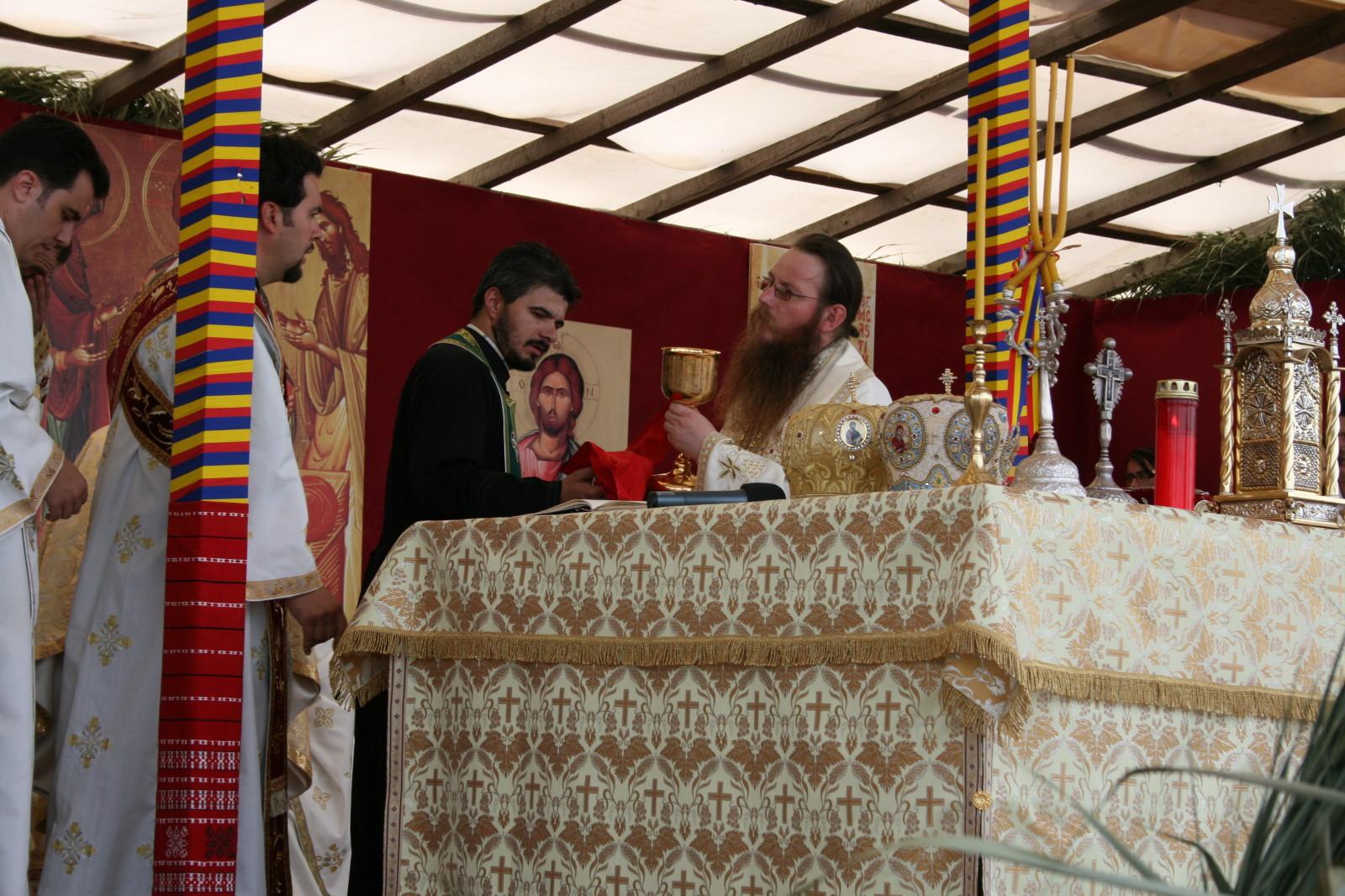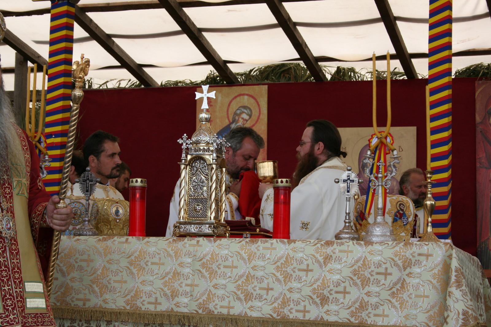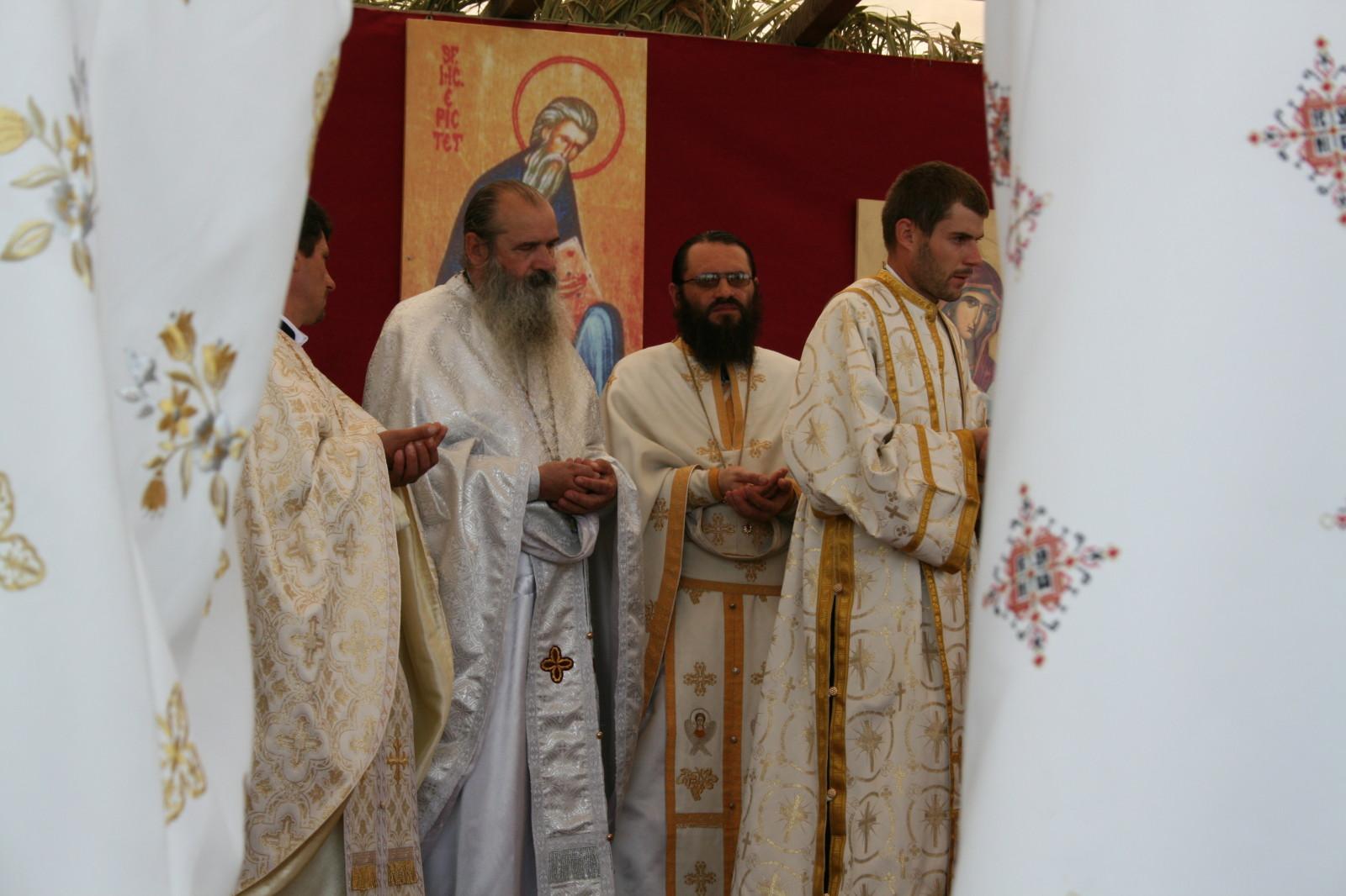 40 de preoţi (au apreciat unii participanţi), diaconi, ipodiaconi şi 5 Arhierei au purtat pe braţe Sfintele Moaşte, ale Sfinţilor Mucenici Epictet şi Astion, din Biserică spre baldachin, să fie acolo la jertfa Liturgică a Lui Hristos, să-i mângâie pe pelerini…