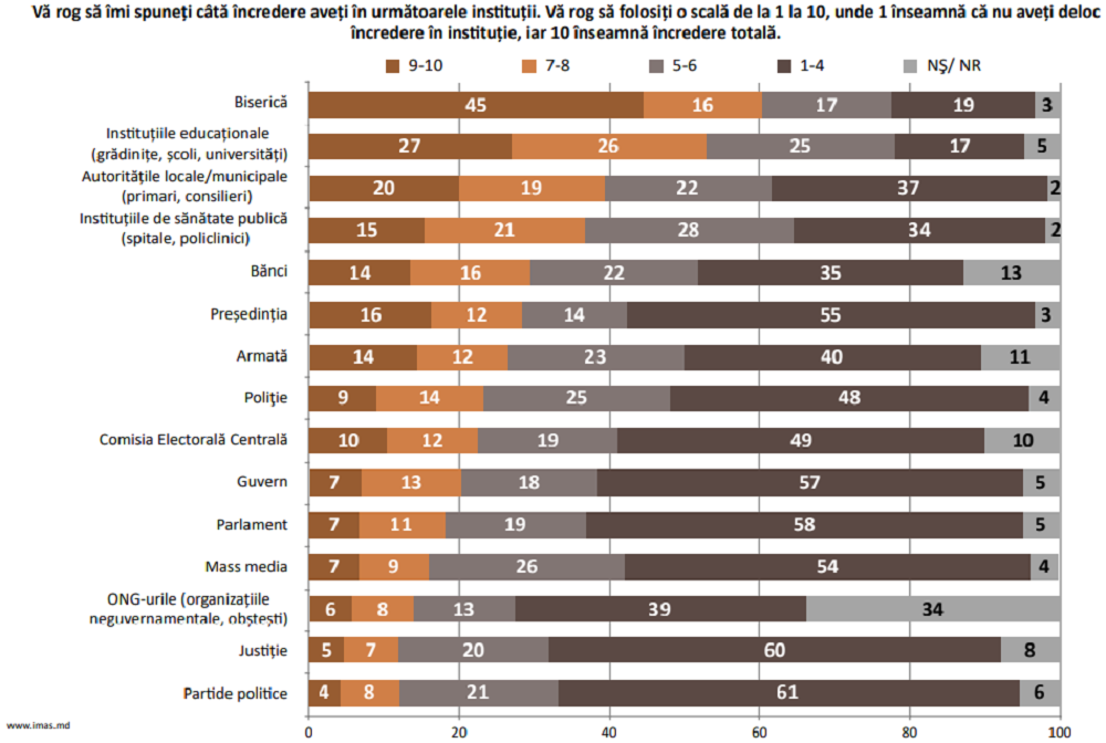 În Republica Moldova, Biserica Ortodoxă a primit 61% din voturile respondenților, clasându-se pe primul loc în ceea ce privește încrederea cetățenilor în instituțiile publice ale țării. Rezultatele studiului, realizat în perioada 18 noiembrie - 4 decembrie 2025, au fost publicate de Institutul de Sociologie din Moldova (IMAS). Datele pentru sondajul IMAS au fost colectate în 87 de localități. Eșantionul a fost format din 1.123 de respondenți.